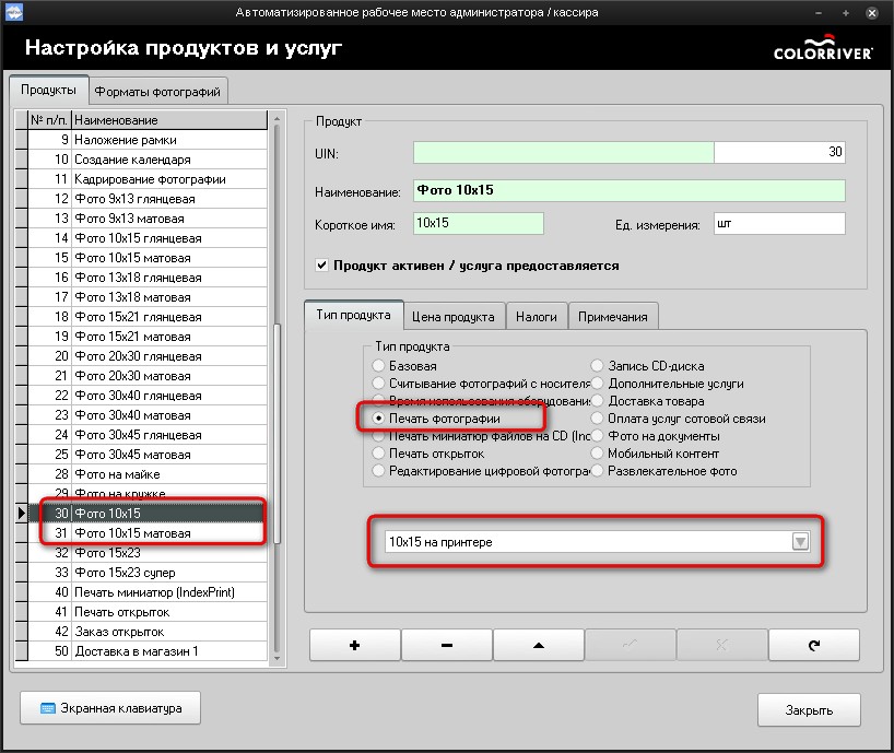 На закладке "Продукты" надо создать 2 продукта "Фото 10х15" и " Фото 10х15 матовая".