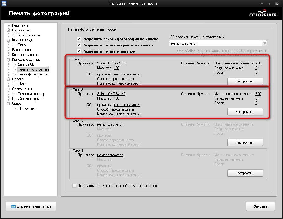 На закладке Выходные данные/Печать фотографий следует настроить Слот 1 и Слот 2.