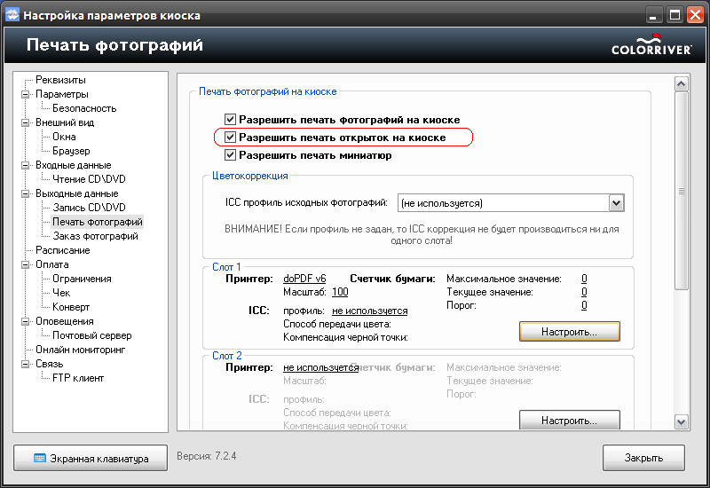 Печать открыток включается\выключается в программе настройки параметров киоска: