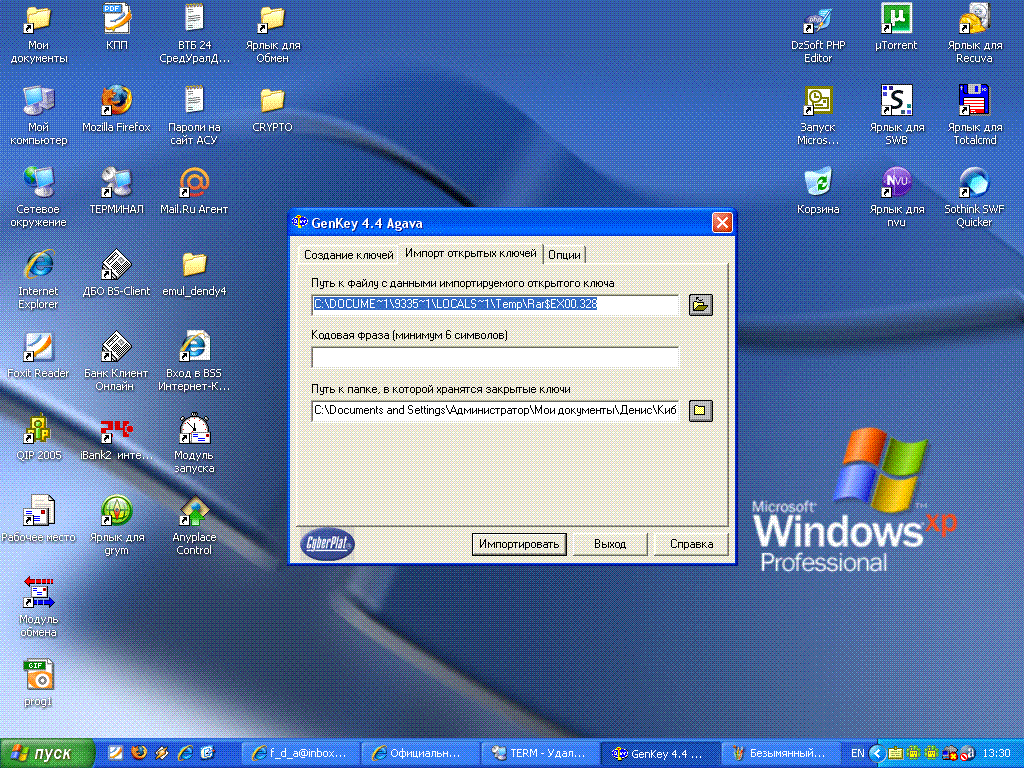 на картинке prog2.gif (закладка иммпорт открытых ключей) виден странный временный путь к файлу открытого ключа. похоже, что вы запускаете программу GenKey напрямую из RAR-архива. Распакуйте программу и запускайте не из архива, и к тому же указывайте правильный путь к открытому ключу.